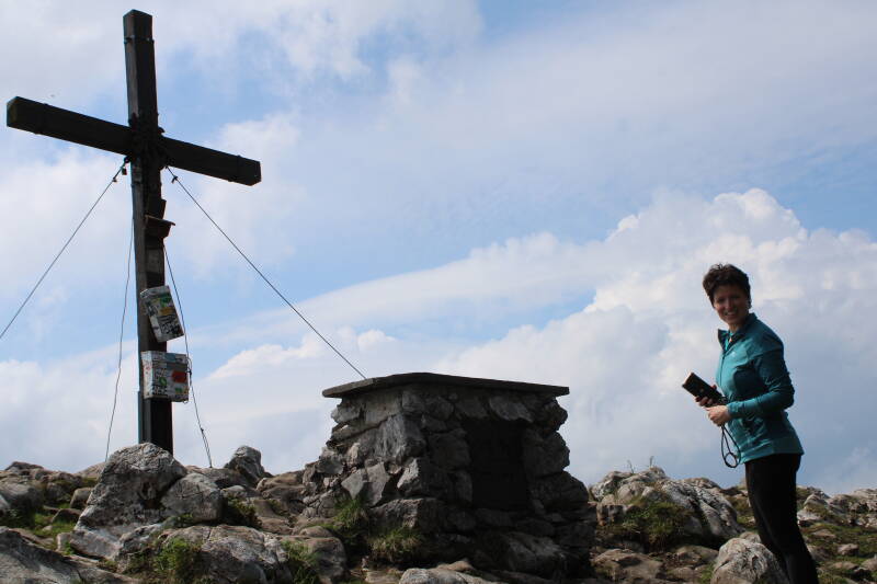 nach einer Weile kommt man aus dem Wald heraus und man zum ersten Mal erahnen, welch großartige Aussicht man hier heroben haben könnte, wenn die Fernsicht etwas besser wäre. nur soll man auch die nähere Umgebung beobachten. es kann leicht sein auch hier schon die ersten Steinböcke zu sehen. wenn nicht. kann man sich an den Abgrund heranwagen. oder eine Linie etwas weiter innen wählen. eine sich in Serpentinen hinaufschlängelte oder eine direkte. eine letzte etwas steilere Passage ehe man sich dem Gipfelplateau nähert. das Gipfelkreuz schon vor Augen. doch dies ist bei dieser Wanderung nicht wirklich das Ziel. befindet man sich doch im Revier einer Steinbockkolonie. ein wenig herumirren ist also gewollt. das Gipfelbuch für einen möglichen Eintrag wartet.