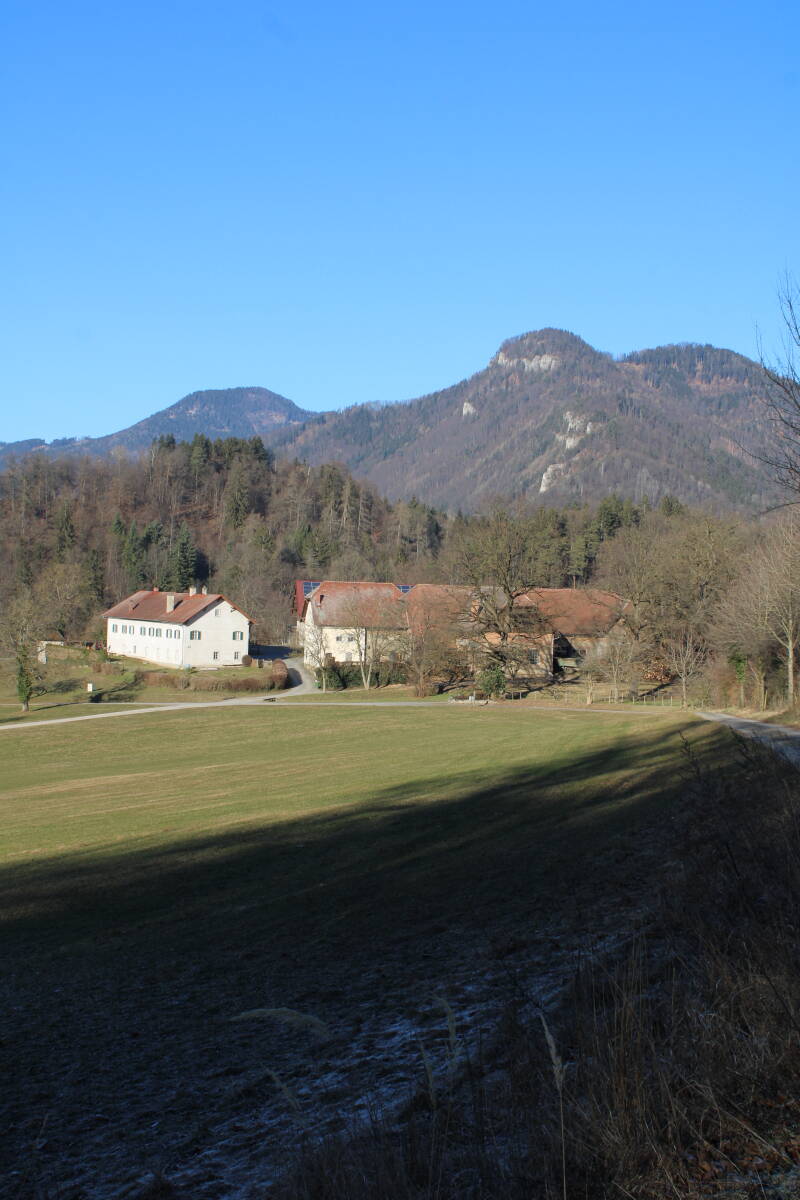 es wird gemütlicher. ich folgte ja einer vorgefertigten Route. den Abstecher zum Fragnerberg muss man nicht unbedingt machen. doch kommt man am Friedenskreuz vorbei. wo zur Zeit auch noch ein geschmückter Christbaum, klar, ansonsten wäre es nur ein Baum, steht. kann sein, daß die Oidi Hulzhitt´n in den wärmeren Monaten bewirtschaftet ist und wandernde Menschen und Menschinnen sich dort zur Rast niederlassen können. ich war nicht dort. kann nicht sagen ob dort eine Tafel mit den Öffnungszeiten angeschlagen war. ich machte kehrt um meine Wanderung langsam wieder talwärts zu lenken. anfangs gab es noch eine steilere Waldpassage. dann folgte aber eine ganze Weile geteerter Untergrund. oder anderweitig fester befestigter Weg. doch fast immer mit Aussicht. keine Ahnung wie all die Berge heißen die ich heute erblickte. den Schöckl. den Zirbitzkogel. die Koralm. Teile der Niederen Tauern. es waren ziemlich viele. einen schönen Flecken Erde haben wir hier bei uns. von dem ich noch einiges erkunden möchte. deshalb komme ich ja immer wieder zurück. auch wenn ich mich verlaufe. vom rechten Wege abkomme. wie nach diesem Hof mit dem Hund. er lenkte mich auch ein wenig ab. Markierungen gab es nicht. und hätte ich ein wenig mehr auf die Karte geschaut. ich hätte nur der Straße entlang gehen müssen. dann wäre ich wieder auf die richtige Route gelangt. so waren es eben ein paar Meter mehr, auch egal. es ging mit mir bergab. war also am richtigen Weg. kam bei einer Ruine vorbei. Betreten verboten. Einsturzgefahr. an einem doch eher großen Gehöft. dem Pichlhof. nun war es nicht mehr weit. da geht man dann eben einfach so vor sich dahin. etwas abgelenkt. und ist schon wieder falsch. eh nur ein paar hundert Meter. doch niemand geht gerne einer Bundesstraße entlang, wenn die Alternative durch einen ruhigen Wald führt. wieder auf die Wiese über die man schon morgens am Weg zum Trötsch marschierte. hier und da begleitet von leichtem Gezwitscher einiger Vögel. zwei Rehe habe ich auch gesehen. ansonsten war es wirklich still. irgendwo etwas Arbeit im Forst. und irgendwann den leichten Lärm der Schnellstraße S35. keine Horden die sich laut unterhaltend auf den selben Weg machten. wären es auch zu anderer Jahreszeit nicht. wer nimmt schon zweiundzwanzig Kilometer auf sich. einsame. keine Möglichkeit zur Einkehr. doch immer die zur Umkehr. auch wenn es eine Rundwanderung war. eine kleine. etwas über dreiundzwanzig Kilometer. etwas über eintausendeinhundert Höhenmeter. etwas über fünfeinhalb Stunden.
