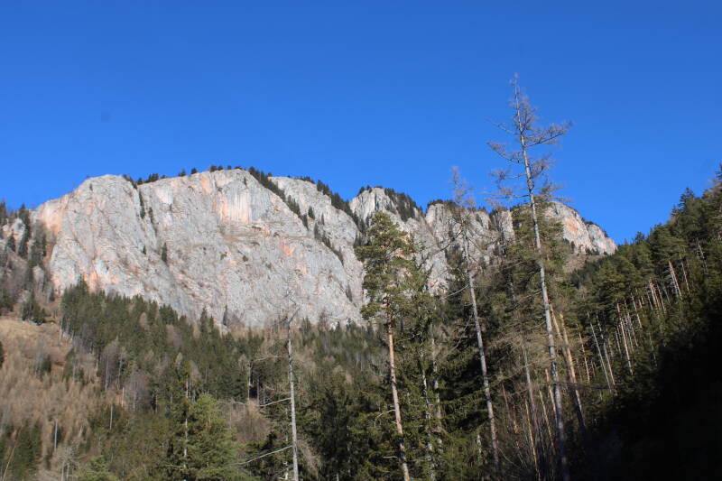wenn man so zu zweit, tratschend, die Gegend bewundernd, frei, dahin wandernd, merkt man gar nicht so sehr wie bescheiden langweilig der Weg eigentlich ist. ein Mittel zum Zweck. manchmal auch willkommen. denn man muss ja nicht sofort mit einem steilen Anstieg ins Abenteuer starten. der sollte eh noch, in abgeschwächter Form, auf uns warten. denn wählt man den Anstieg über den Jägersteig, so steckt es schon im Namen, muss man den üblichen Weg verlassen, um auf den Weg zu wechseln, über den man sonst zurückkommen würde, wenn man nicht eine andere Passage für den Rückweg wählen würde. demnach ging es bei der ersten Weggabelung scharf rechts. doch dann sollte man ein wenig aut den Weg achten. sonst läuft man an der Abzweigung vorbei. irgendwann geht es eben links rauf. ob ich den Pfad jetzt alleine nochmals finden würde. aber gewiss doch. hab ja einen gpx-Track und weiß auch Karten zu lesen. hat man den Jägersteig erst ausgemacht ist es zumeist ein leichtes diesem zu folgen. es gibt nur einen Weg. und blaue Punkte die seinen Verlauf weisen. hin und wieder wird man auch die Hände zur Hilfe nehmen müssen. doch sind nirgendwo Stellen die wirklich mehr als einfach nur Trittsicherheit verlangen würden. ich weiß aber nicht ob ich alleine dort hoch würde. wahrscheinlich auch deshalb, weil ich lieber mit anderen auf die Rote Wand gehe. und ich hab ja auch schon wieder eine neue Idee.